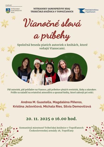 Vo štvrtok 20.11.2025 o 16:00 h sa stretne päť autoriek na besede o knihách, ktoré majú spoločnú tému - Vianoce. Všetky autorky totiž uviedli do života knihy, ktorých dej sa odohráva vo vianočnom období. Do Tribečskej knižnice zavítajú Andrea M. Guastella (Popletené Vianoce), Magdaléna Piñeros (Vianočný duet), Kristína Ježovičová (Vianočný bozk), Michala Ries (24 dní do Vianoc) a Silvia Demovičová (Na Vianoce chcem len teba, Na Vianoce budem doma).