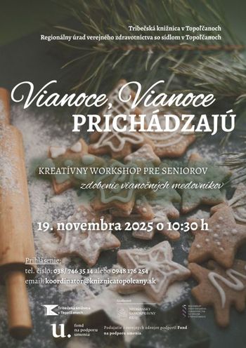 Pozývame Vás na vianočné zdobenie medovníkov v knižnici. Kreatívny workshop pre seniorov sa uskutoční v stredu 19.11.2025 o 10:30 v komunitnej miestnosti Tribečskej knižnice. Naučíte sa rôzne výtvarné techniky zdobenia a vytvoríte si vlastné vianočné medovníky.