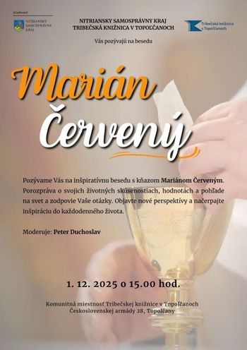 V pondelok 1.12.2025 privítame v knižnici vzácneho hosťa – rímskokatolíckeho kňaza, spisovateľa literatúry faktu a topoľčianskeho rodáka Mariána Červeného. Porozpráva o svojich životných skúsenostiach, hodnotách a pohľade na svet, zodpovie na otázky návštevníkov. Besedu, ktorá začne o 15:00 h bude viesť Peter Duchoslav. Využite v prvý decembrový deň príležitosť na opätovné stretnutie s touto významnou osobnosťou nášho regiónu.