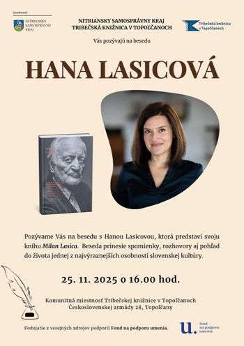 Pozývame Vás na besedu so spisovateľkou a scenáristkou Hanou Lasicovou. V roku 2024 jej vydalo vydavateľstvo Ikar knihu Milan Lasica. Toto dvojzväzkové dielo má 800 strán a váži takmer 5 kg. Beseda sa uskutoční v utorok 25.11.2025 o 16:00 h v komunitnej miestnosti Tribečskej knižnice.