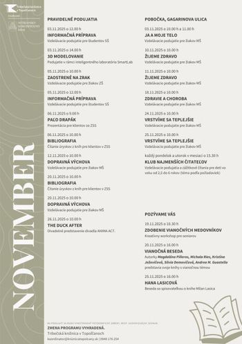 Vo štvrtok 20.11.2025 o 16:00 h sa stretne päť autoriek na besede o knihách, ktoré majú spoločnú tému - Vianoce. Všetky autorky totiž uviedli do života knihy, ktorých dej sa odohráva vo vianočnom období. Do Tribečskej knižnice zavítajú Andrea M. Guastella (Popletené Vianoce), Magdaléna Piñeros (Vianočný duet), Kristína Ježovičová (Vianočný bozk), Michala Ries (24 dní do Vianoc) a Silvia Demovičová (Na Vianoce chcem len teba, Na Vianoce budem doma).