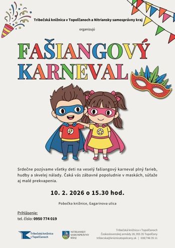 Pozývame deti na fašiangový karneval, ktorý sa uskutoční v utorok 10.2.2026 o 15:30 v pobočke Tribečskej knižnice na Gagarinovej ulici.