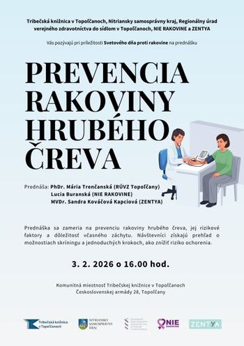 Pozývame Vás na prednášku Prevencia rakoviny hrubého čreva, ktorá sa uskutoční v utorok 3.2.2026 o 16:00 h v komunitnej miestnosti Tribečskej knižnice. Prednášať budú: PhDr. Mária Trenčanská z Regionálneho úradu verejného zdravotníctva, Lucia Buranská z pacientskej organizácie NIE RAKOVINE a MVDr. Sandra Kováčová Kapciová zo spoločnosti Zentya.