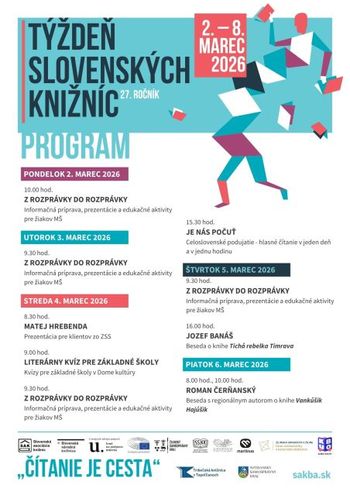 V čase od 6.3. – 12. 3. 2023 sa uskutoční 24. ročník celoslovenského podujatia Týždeň slovenských knižníc pod spoločným mottom KNIŽNICE PRE VŠETKÝCH – Knižnice, záruka kvalitných informácií
