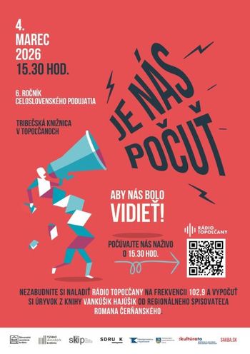 Aj tento rok sa Tribečská knižnica v Topoľčanoch zapojí do 6. ročníka celoslovenského podujatia “Je nás počuť 2026”. V tento deň knižnice v rovnakom čase spoločne upozornia na dôležitosť čítania a krásu literatúry. V stredu 4. marca 2026 o 15.30 hod. sa bude na celom Slovensku nahlas čítať – či už pred knižnicou, na sociálnych sieťach, v rozhlase... Preto si nezabudnite v uvedenom čase naladiť Rádio Topoľčany na frekvencii 102,9 a vypočuť si úryvok z knihy Vankúšik Hajúšik od regionálneho autora Romana Čerňanského.