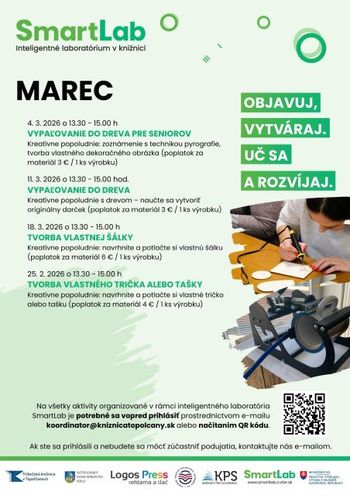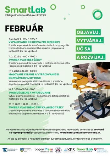 Počas letných prázdnin sa každý utorok budeme tešiť na stretnutia v inteligentnom laboratóriu SmartLab, kde vás čaká 3D tlač, pyrografia, výroba vlastného dizajnu na tričko, tašku či šálku a kopec zábavy pre deti aj dospelých. Skvelá príležitosť, ako spoločne objavovať nové technológie, rozvíjať kreativitu a vytvoriť si originálne výrobky.