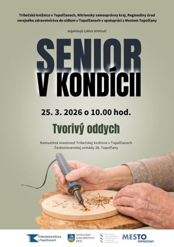 V stredu 25.3.2026 pokračuje seriál podujatí Senior v kondícii. Témou a názov druhého stretnutia je Tvorivý oddych. Podujatie začína o 10:00 h.