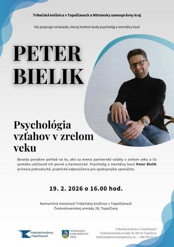 Vo štvrtok 19.2.2026 o 16:00 h sa v komunitnej miestnosti uskutoční beseda so psychológom a mentálnym koučom Petrom Bielikom. Témou besedy bude "psychológia vzťahov v zrelom veku" – ako sa menia partnerské vzťahy v zrelom veku a čo pomáha udržiavať ich pevné a harmonické. Peter Bielik prinesie jednoduché, praktické odporúčania pre spokojnejšie spolužitie.