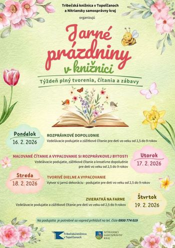 Tribečská knižnica organizuje počas jarných prázdnin sériu podujatí pre deti vo veku 2,5 – 9 rokov. V dňoch 16.2.2026 – 19.2.2026 sa uskutoční každý deň jedno podujatie. Deti môže zažiť rozprávkové dopoludnie, maľované čítanie, tvorivé dielne alebo aj zvieratká na farme. Na podujatia je voľný vstup, treba sa len vopred prihlásiť na tel. č.: 0950 774 019.
