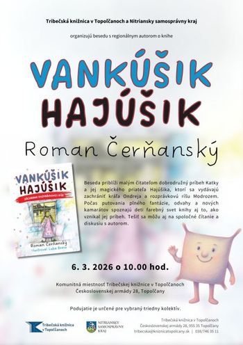V piatok 6.3.2026 o 10:00 h sa uskutoční beseda s regionálnym autorom Romanom Čerňanským. Ten napísal knihu Vankúšik Hajúšik s podtitulom Záchrana rozprávkovej ríše. Beseda priblíži malým čitateľom dobrodružný príbeh Katky a jej magického priateľa Hajúšika, ktorí sa vydávajú zachrániť kráľa Ondreja a rozprávkovú ríšu Modrozem. Podujatie je určené pre vybraný triedny kolektív.